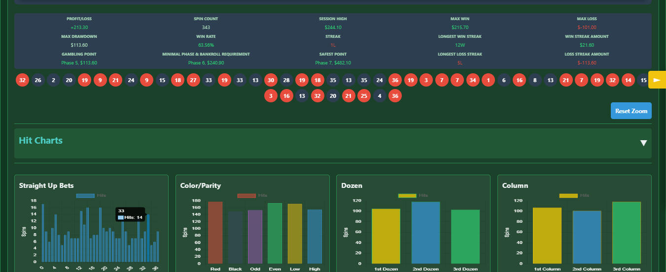 My services include high-quality screenshots like these, showcasing your strategy’s structure, performance trends, max losing streaks, gambling point phases, and hottest numbers for a clear view of success and progression issues.