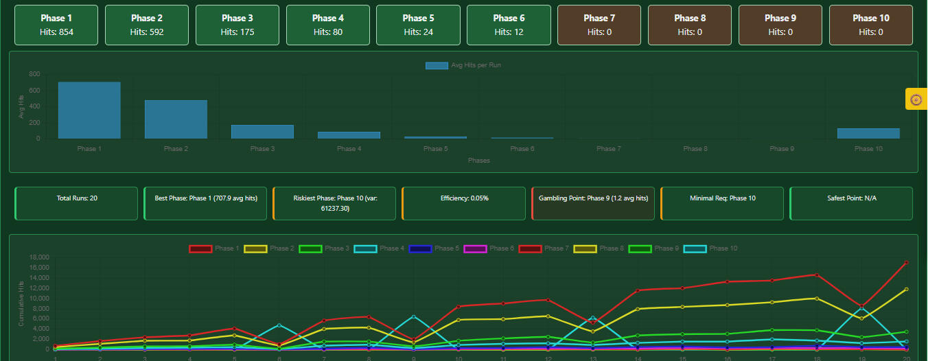 Discover how your strategy handles max losing streaks, gambling point phases, minimal bankroll needs, and safest points—insights other simulators can’t provide.